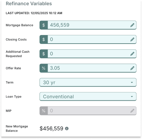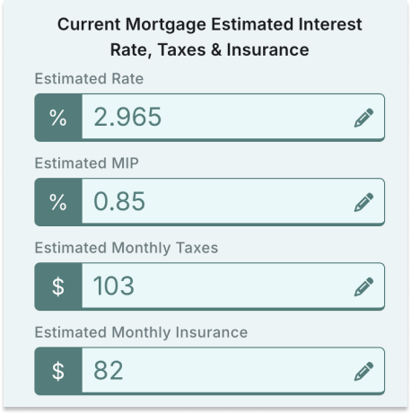 Editable values that quickly show critical current mortgage details, allowing you to quickly determine the homeowner's current mortgage balance and payment.