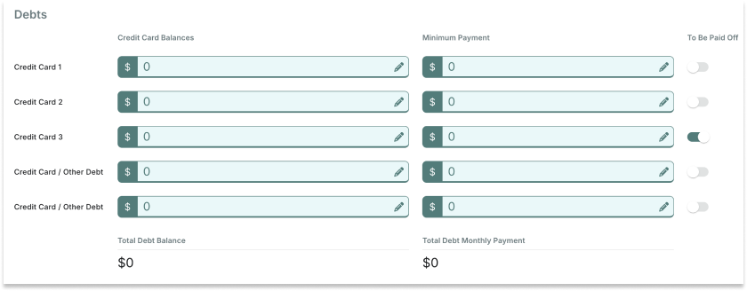 Review and adjust the homeowner's debts and select whether the new mortgage will pay off each of them.