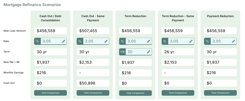 This section allows you to compare five refinance scenarios and edit critical refinance scenarios. Next, select the "View Comparison" button to see key details about mortgage options customized to the current homeowner.