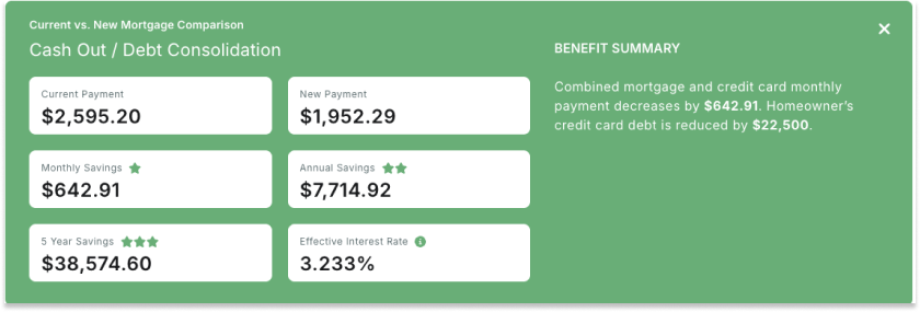 Compare mortgage outcomes, including savings, rate and payment. You can also share this information with the homeowner.